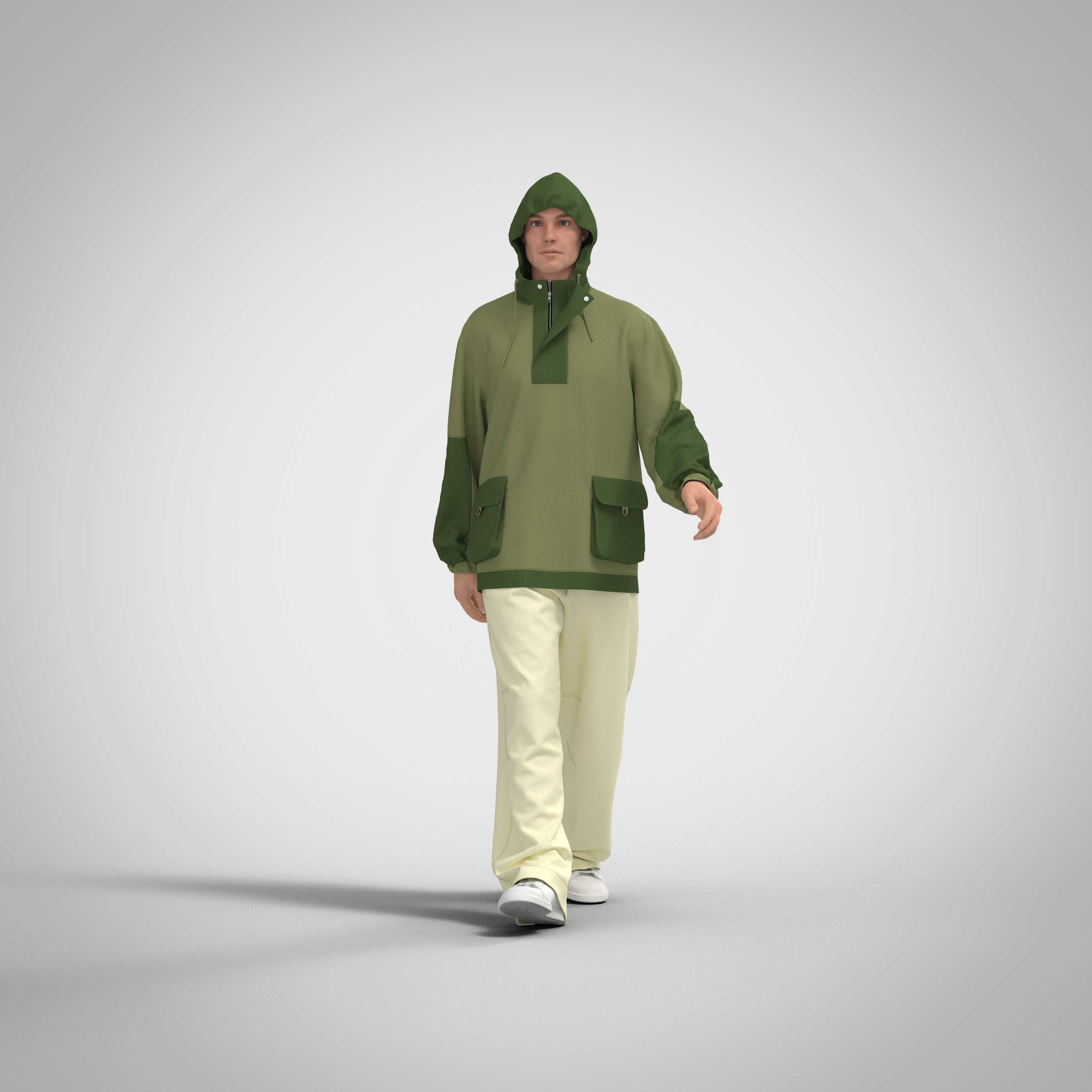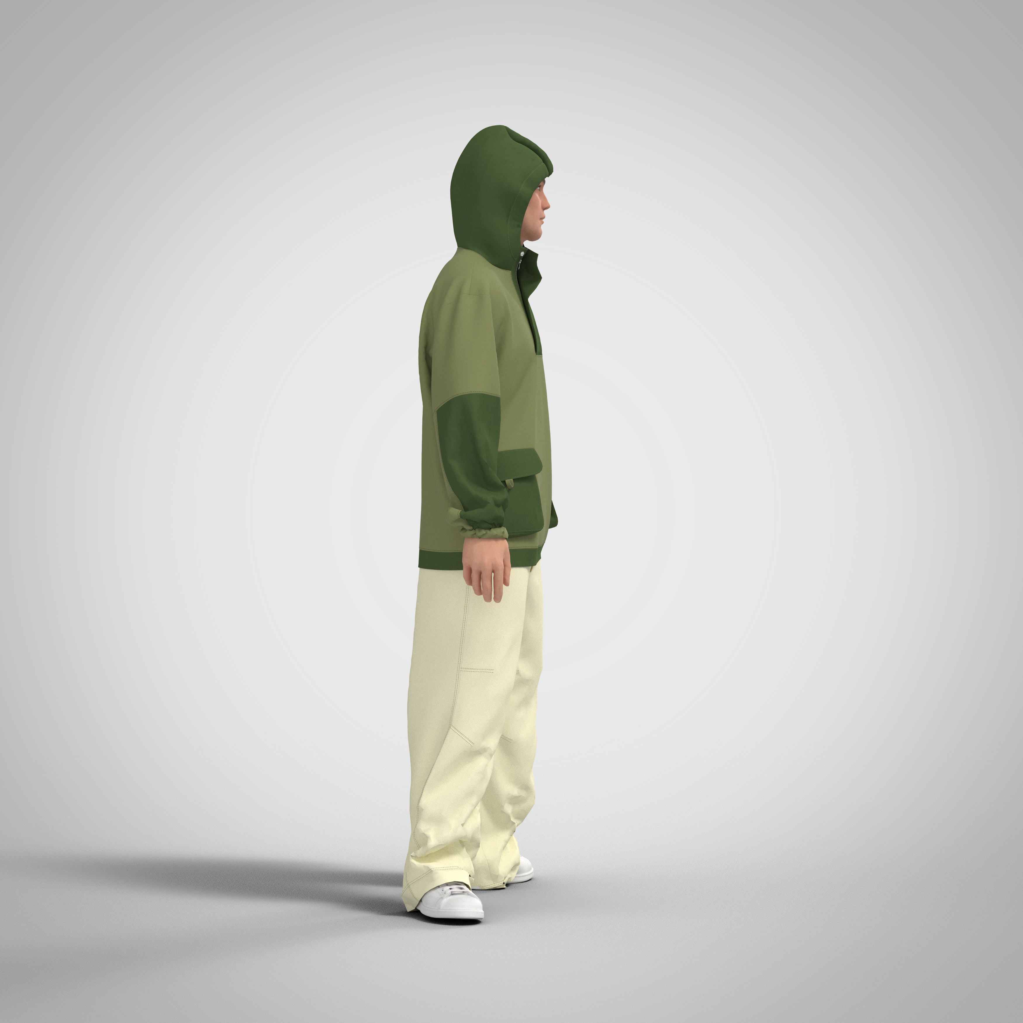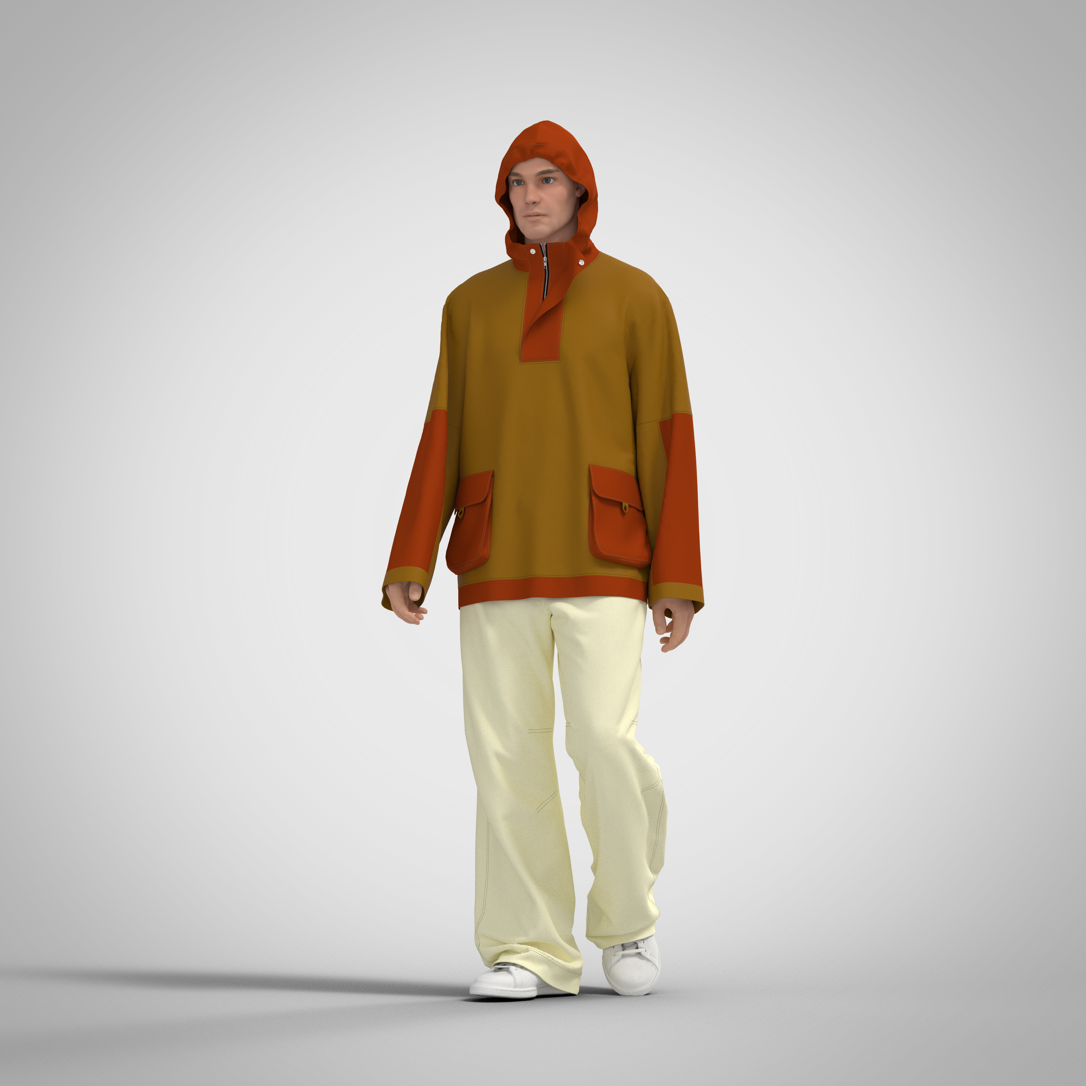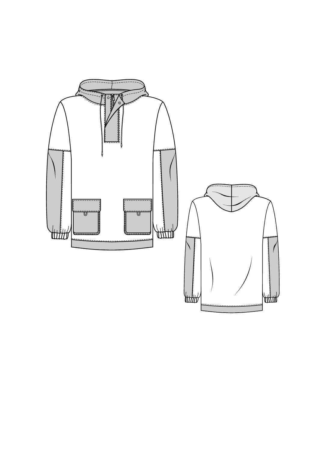 Men’s straight silhouette sweater (hoodie), moderate volume, length below the hip line, with shirt sleeves, combined. On the front in the center, there is a wide clasp – polo, the inner bar fastens with a zipper, at the bottom there are two patch pockets – briefcase with a valve, the pockets are rectangular with rounded bottom corners, the volume of the pocket is achieved by sewing a trim around the main part. In the center of the valves are air loops. The back is whole, there is a sewn-in detail (belt) at the bottom of the sweater. The hood is single seam, with a cord along the front edge, the ends of which are brought out through eyelets and fixed with clips that regulate the degree of fit to the head, the hood is lined with thin knitted fabric in the color of the main fabric, the neck is edged with knitted braid, the cut of the hood fastener is sewn into the trims of the fastener – polo. Sleeve, long, with a horizontal seam at shoulder level, with vertical inserts in the center of the sleeve, the bottom of the sleeve is gathered on a wide elastic band. On the pocket, flap, armholes, neck, neckline, sewing seams of the sleeve parts, on the clasp placket there is a finishing stitch at 0.5 – 0.7 cm, on the front edge of the hood there is a stitch at a distance of 2.5 cm from the edge. The front, back, upper and side parts of the sleeve are made of the main fabric. The hood, polo button trims, pockets, flaps, center inserts on the sleeves, and the belt are made of the companion fabric. The main fabric and companion fabric in tonal combination with each other. Base size: height -176 cm, chest circumference -104 cm, hip circumference -104 cm. The length of the basic size – 71.0 cm, the consumption of the main fabric 1.10 m., companion fabric – 0.60 m. Recommended sizes: 46 – 56 (chest circumference 92.0 cm. – 112.0 cm.), height 158 – 188.