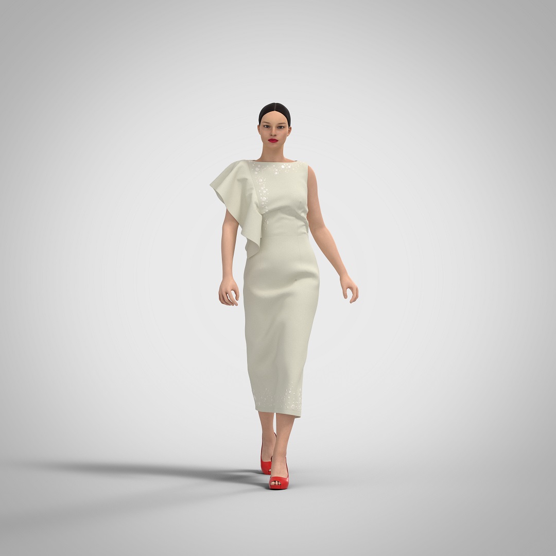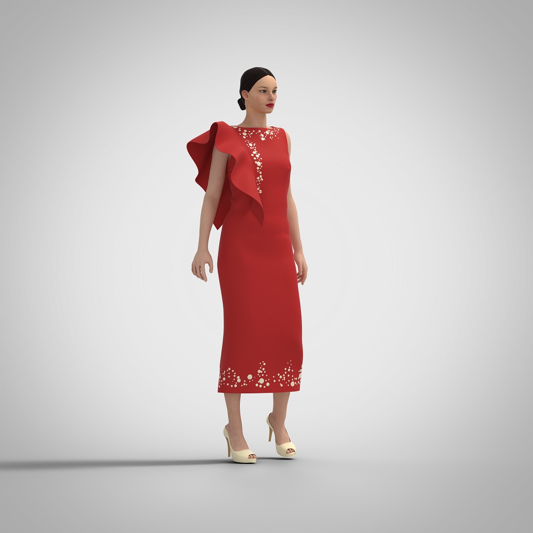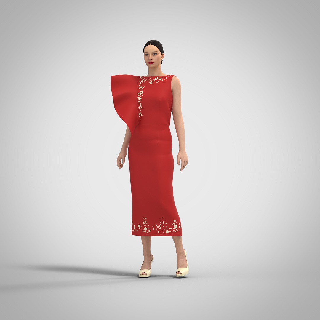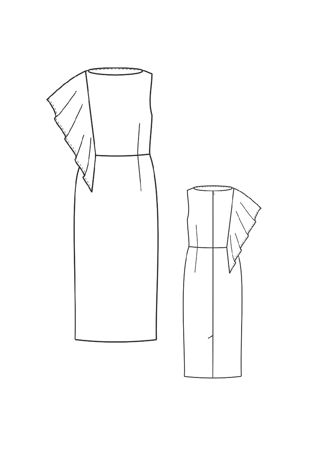 Dress for the middle age group, designed for celebrations or everyday life in the warm season. The dress is a fitted silhouette, small volume, length below the middle of the calf, sleeveless, cut off at the waist, with an asymmetrical shoulder line. Zipper on the middle seam of the back on a hidden zipper. The bodice of the dress is asymmetrical – on the right side in the relief seam on the front and back there is a flounce; on the left side there are darts on the waist line, the solution of the breast dart is also translated into waist darts. The back with a middle seam ending with a slit and waist darts for a better fit. The neckline has a boatneck shape. The shoulder line is reduced from the final shoulder point by 2 cm. Base size: height -164 cm, chest circumference – 92 cm, hip circumference – 98.0 (100 cm). The length of the basic size product at the center seam of the back – 113.0 cm, the main fabric consumption is 1.7 m. Recommended sizes: 40 – 96 (chest circumference 84.0 cm. – 96.0 cm.), height 152 – 182 cm.