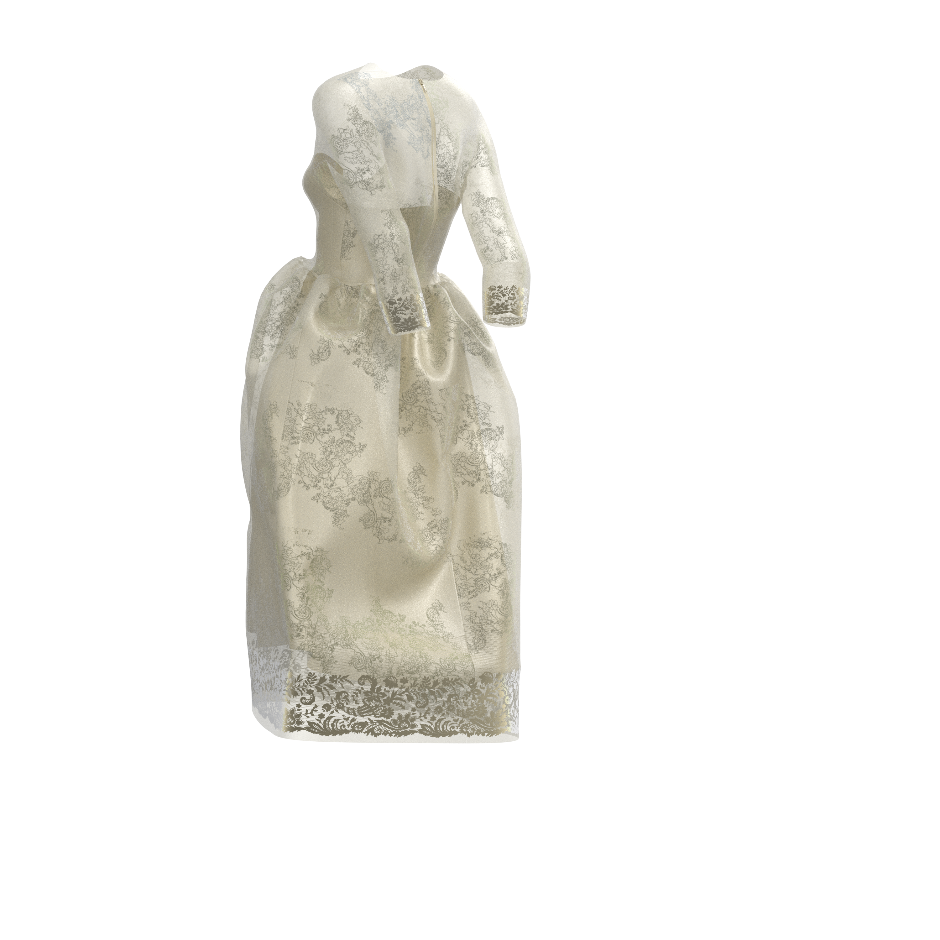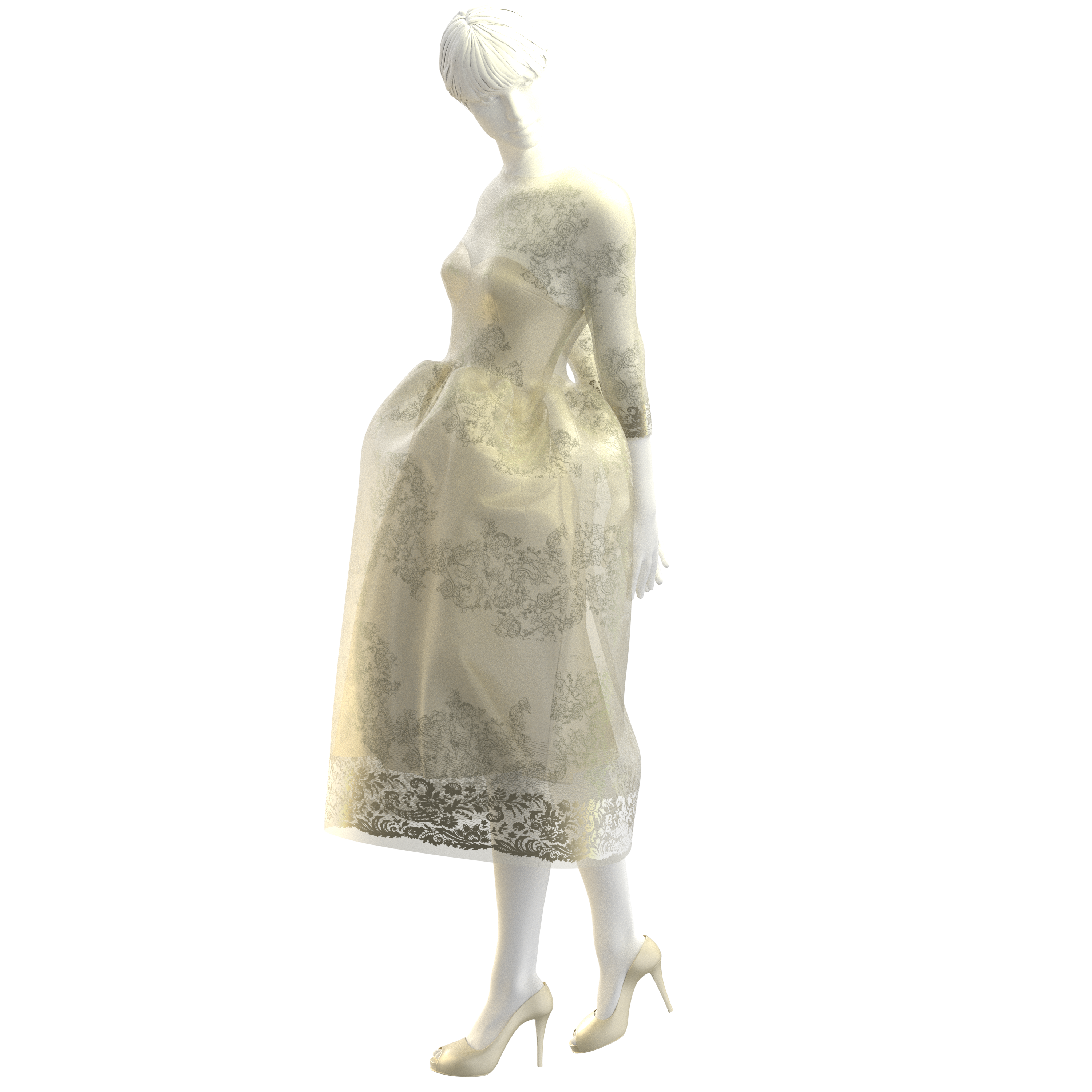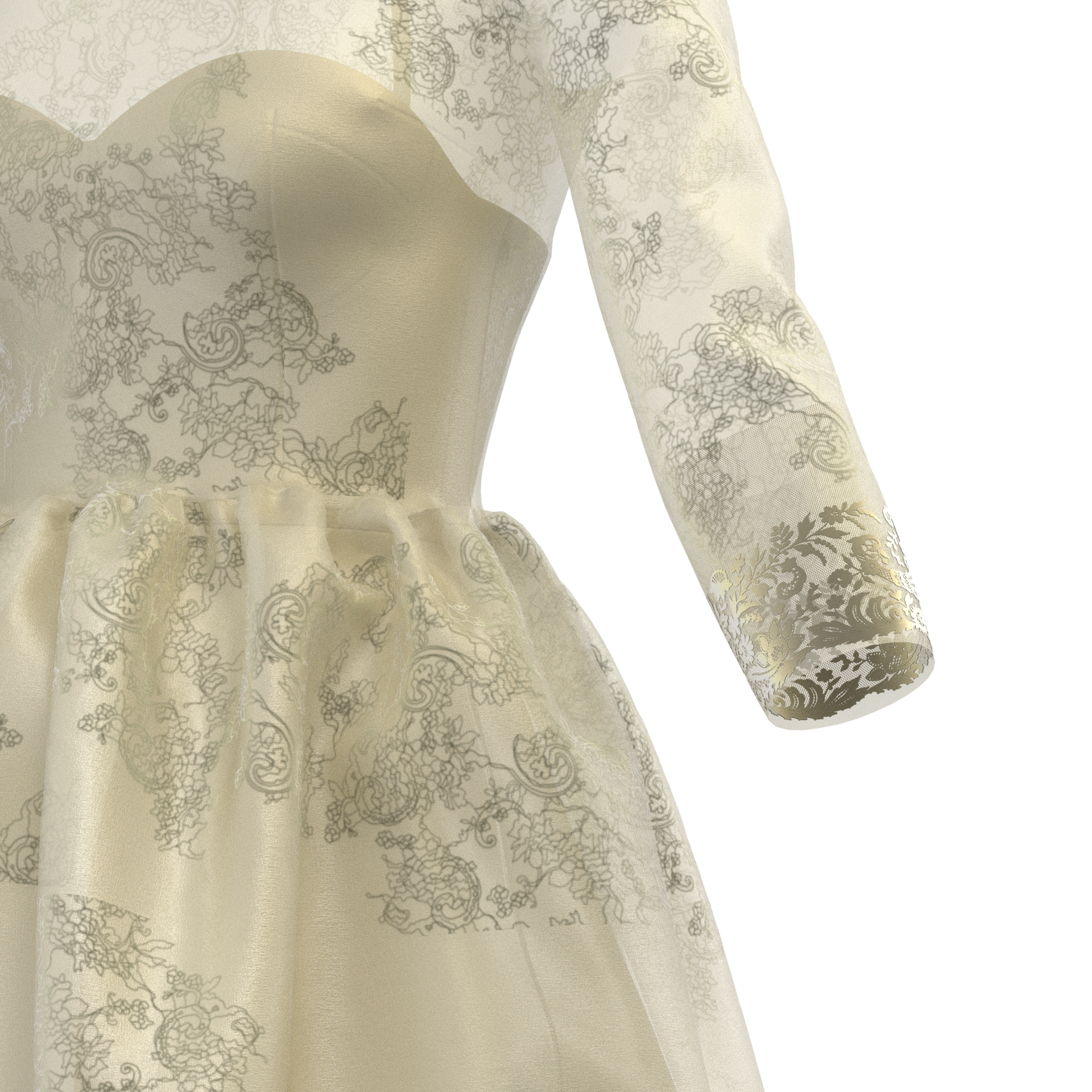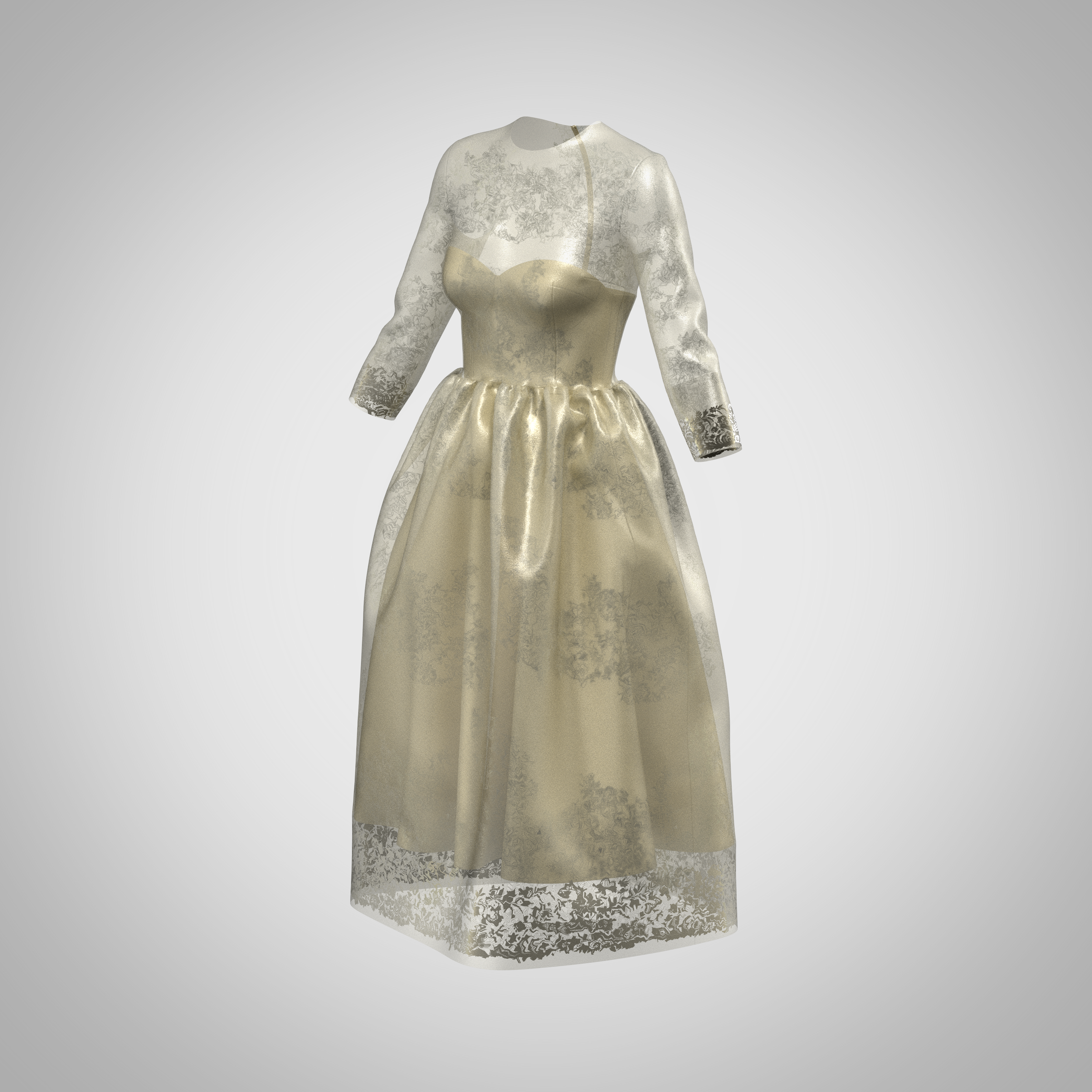 Women’s dress semi-fitted bodice with an ankle-length skirt, designed for celebrations, regardless of the season. The dress has a top and bottom layer, which are fixed between each other at the waist line. The lower layer of the dress has a corset bodice. There are scallops on the front, with the help of which the bodice sits perfectly on the chest. On the back there are also reliefs for a better fit. The skirt is half-solvent. The upper layer of the dress has a high degree of transparency in order to see the bottom layer. On the front of the bodice there are waist and breast darts. The back has no constructive lines. The neck is round, has no recess. The sleeve is indented, three-quarter length, has a high degree of fit. The lower part of the dress is gathered at the waist. The waist line is exaggerated. There is a hidden zipper on the back of the dress.
