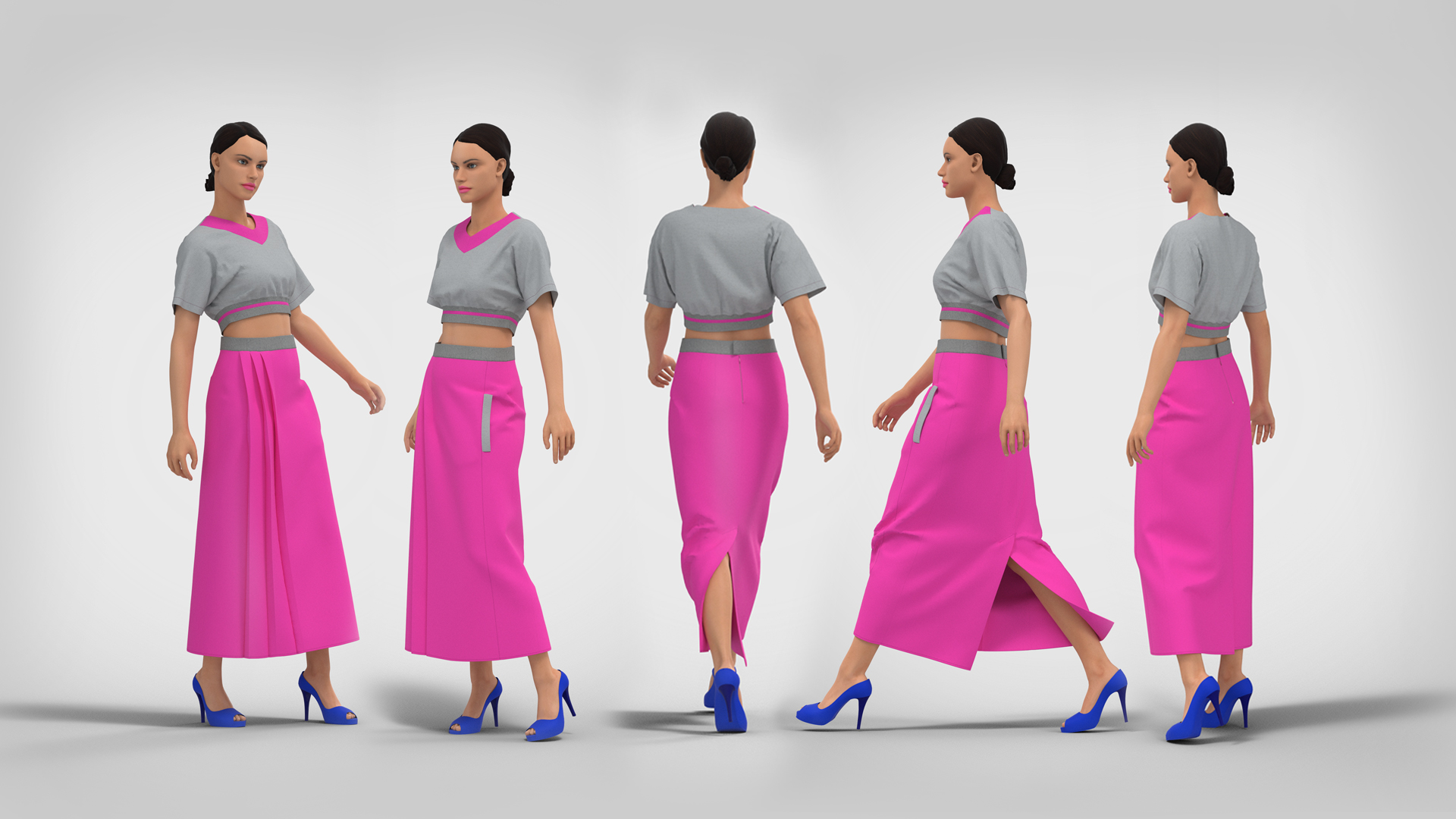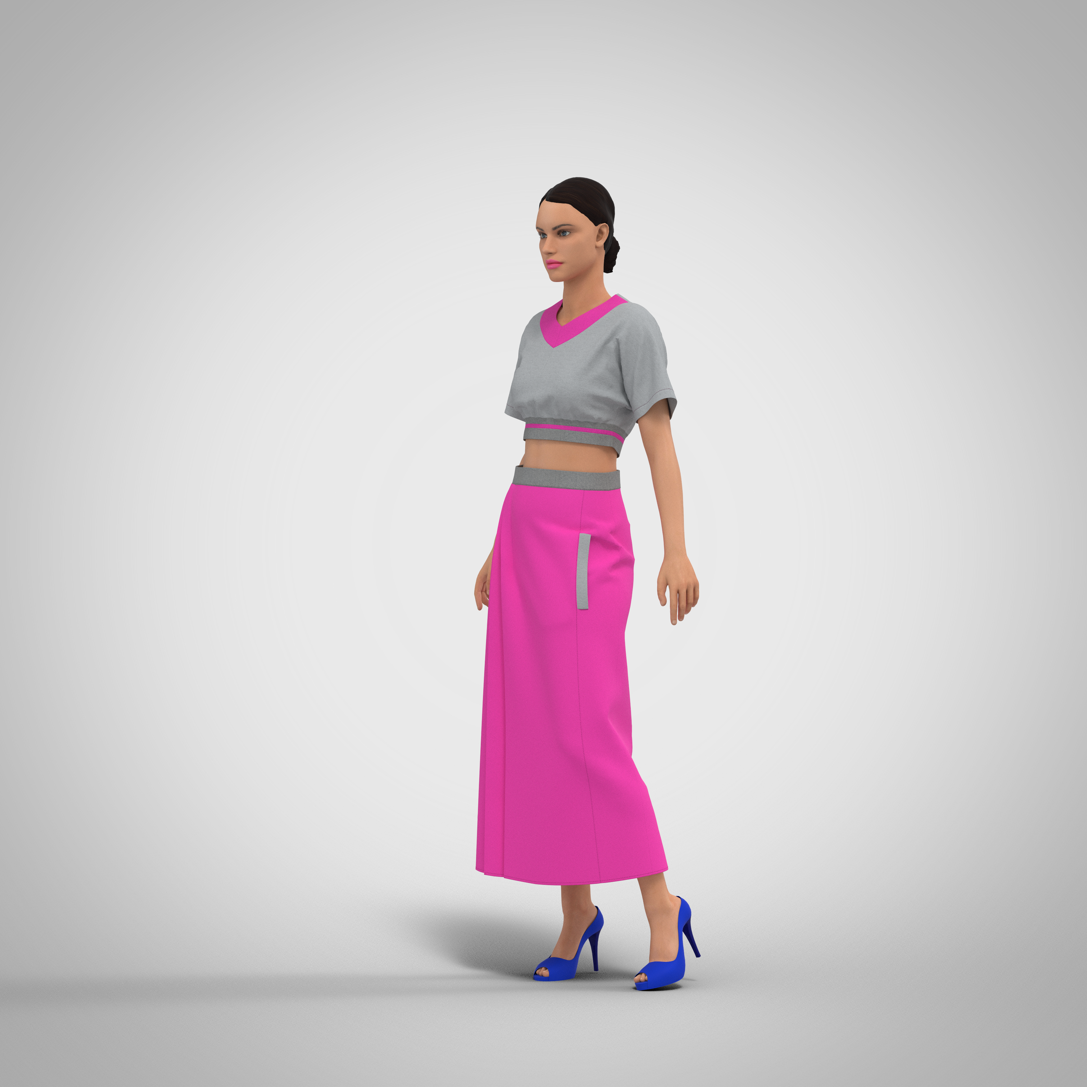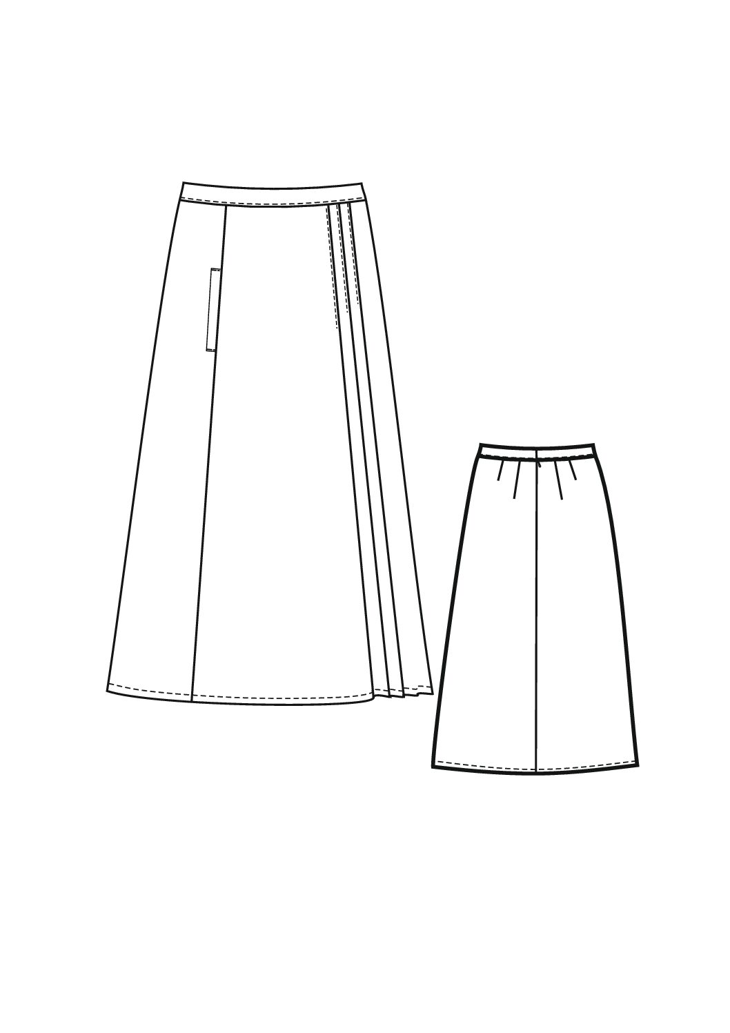 Below-knee length skirt (midi), with a group of one-sided folds of medium depth laid by the outer fold to the side cuts on the front panel at the side of the skirt and a side relief in which there is a pocket with a fitted leaf. Back panel with a middle seam in which there is a hidden zipper and two pairs of waist darts of different lengths. The waistband is fitted, the width of the waistband is 4 cm. The length of the basic size (46/164) – 85 cm, fabric consumption 1.70 m. Recommended sizes: 40-50; height 152-182.