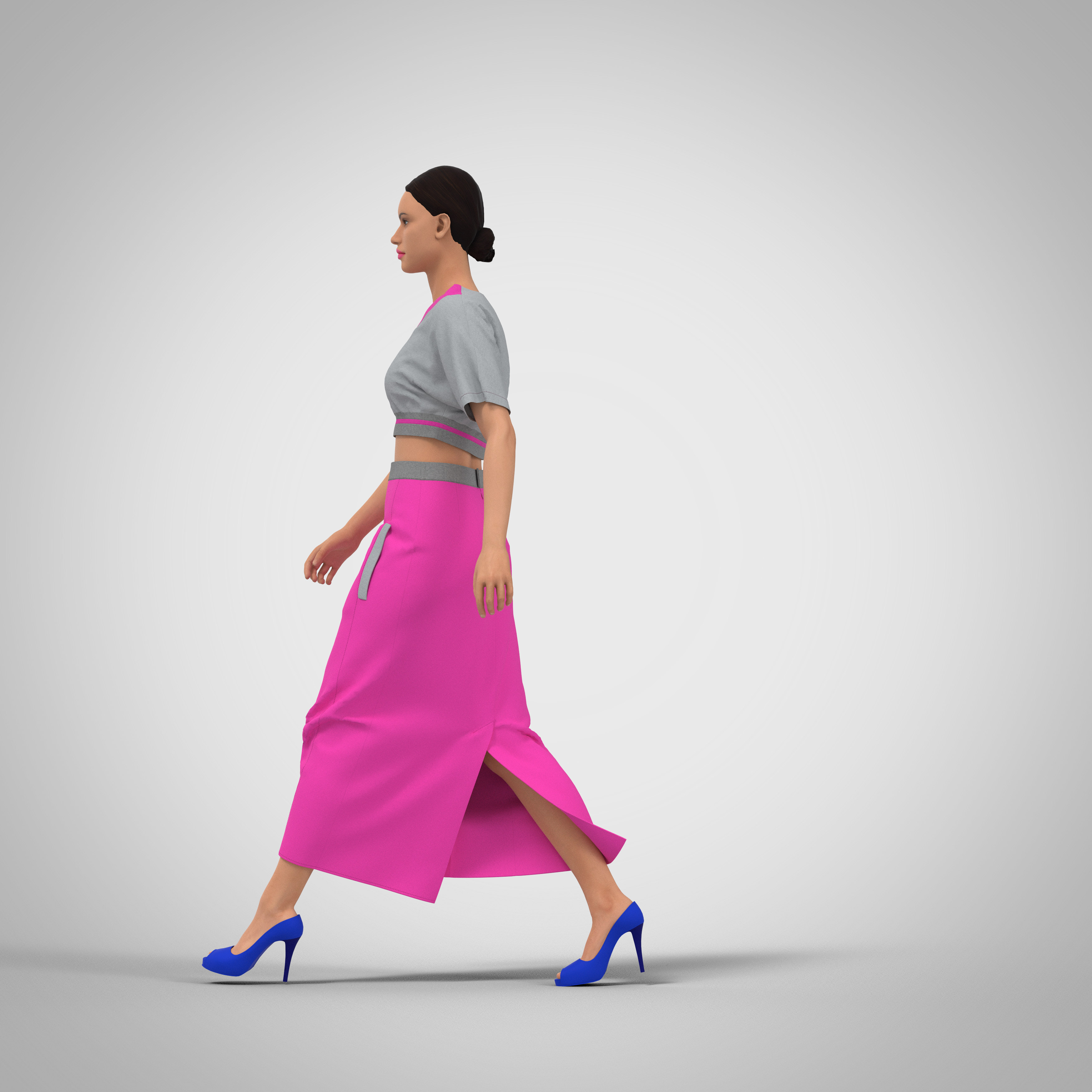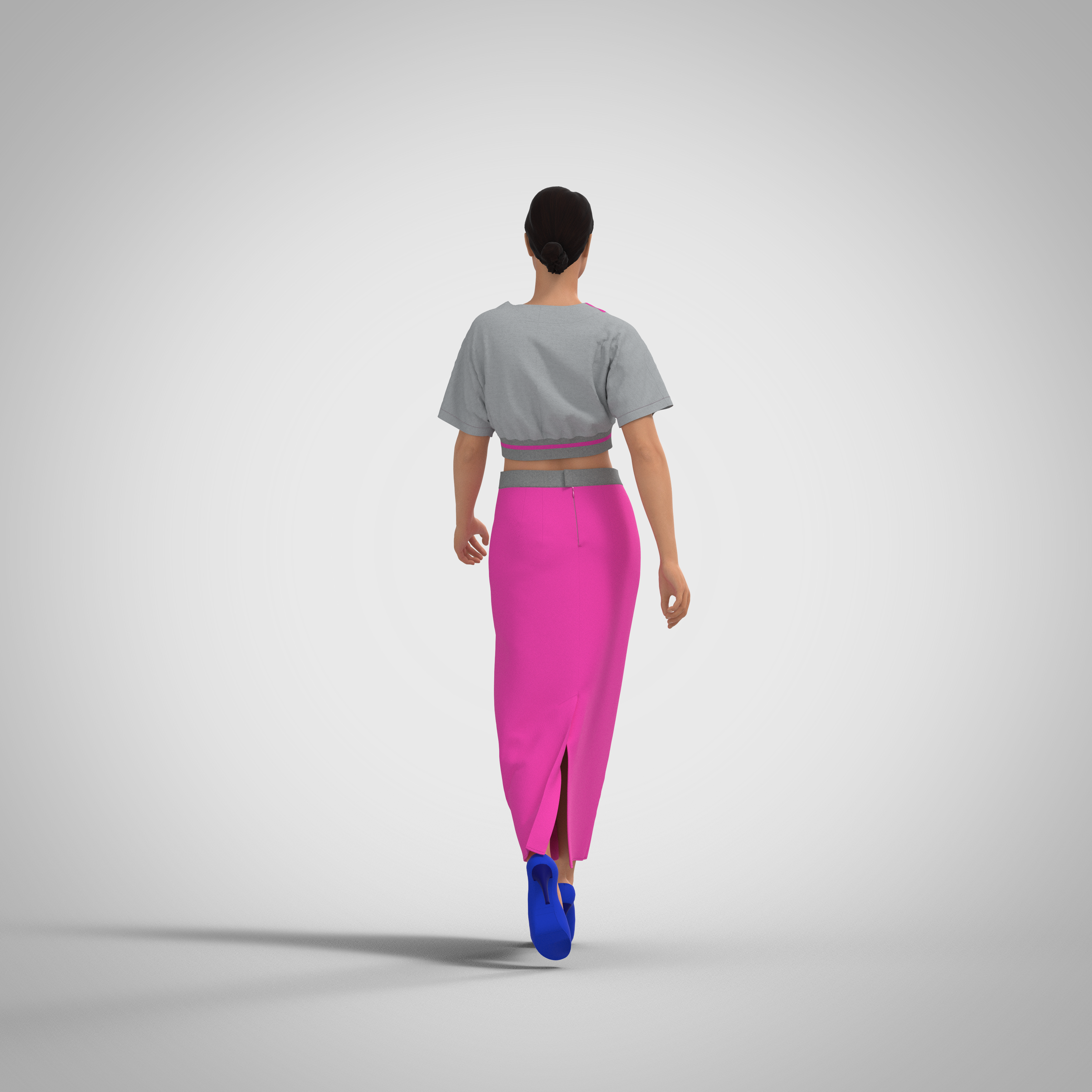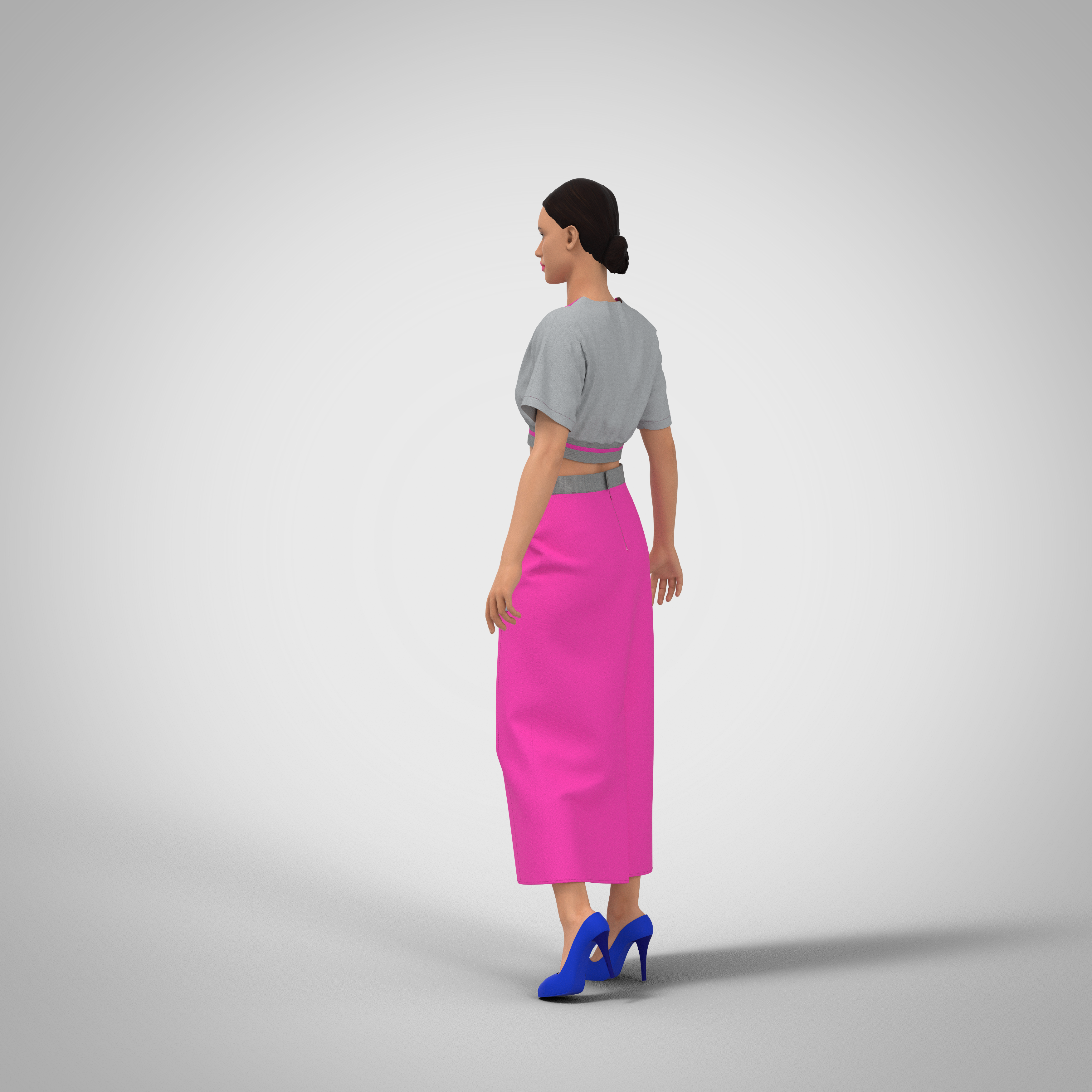 Below-knee length skirt (midi), with a group of one-sided folds of medium depth laid by the outer fold to the side cuts on the front panel at the side of the skirt and a side relief in which there is a pocket with a fitted leaf. Back panel with a middle seam in which there is a hidden zipper and two pairs of waist darts of different lengths. The waistband is fitted, the width of the waistband is 4 cm. The length of the basic size (46/164) – 85 cm, fabric consumption 1.70 m. Recommended sizes: 40-50; height 152-182.