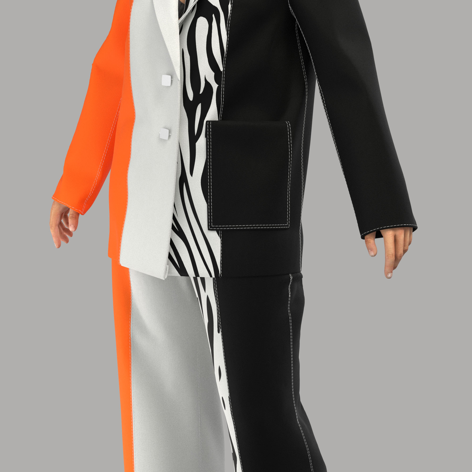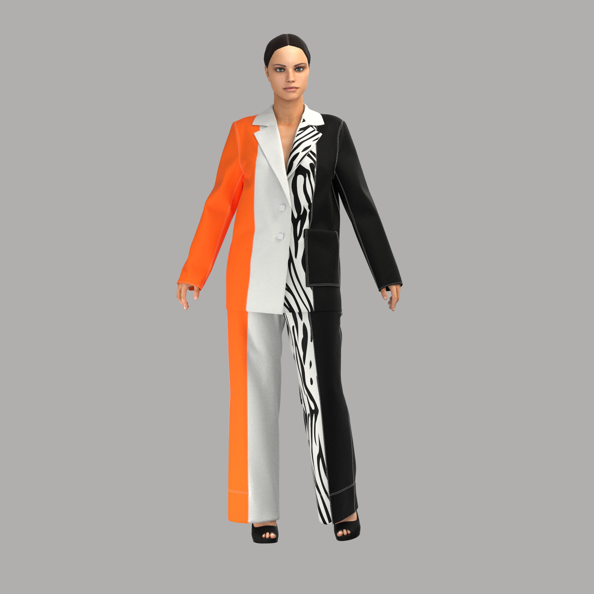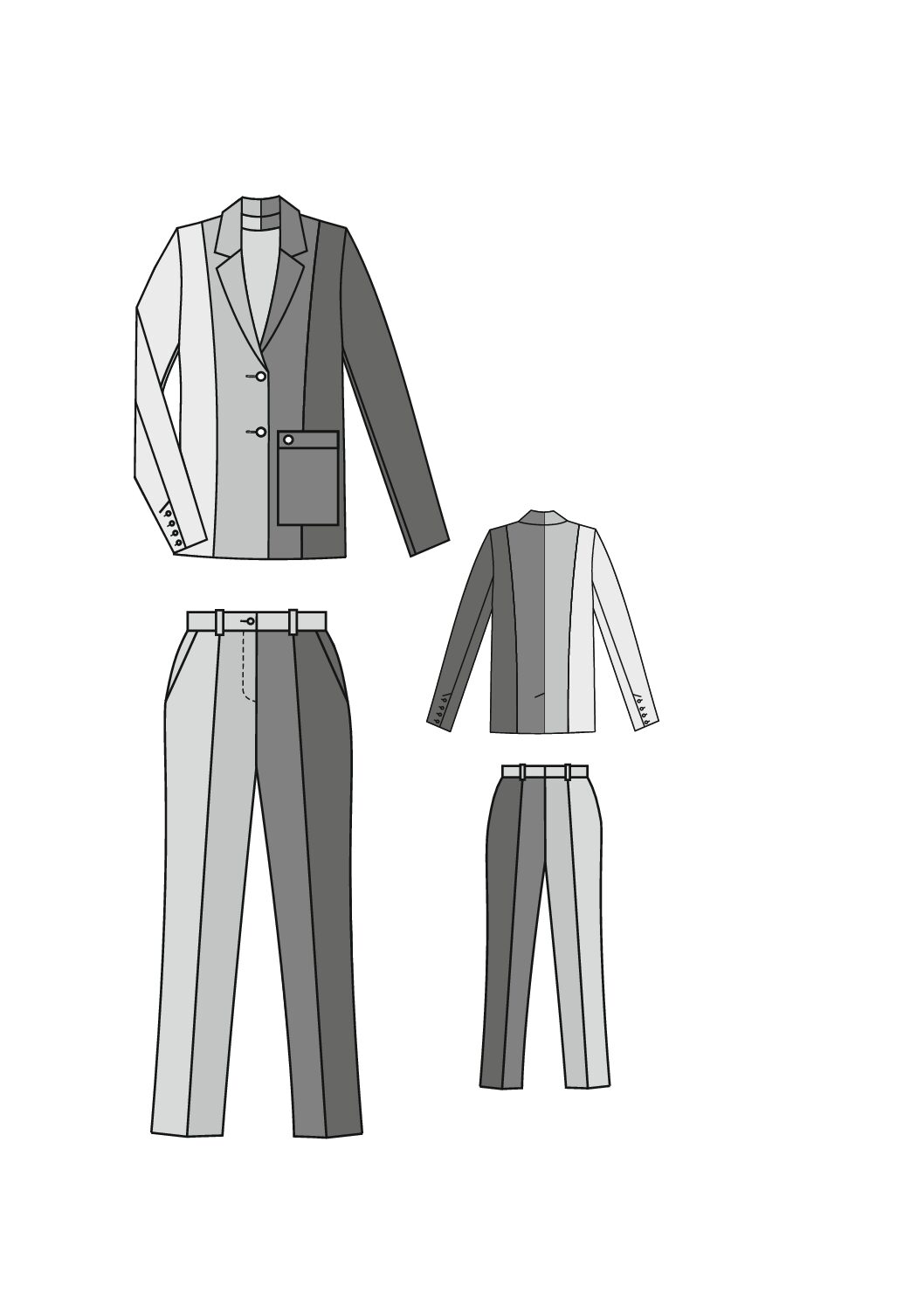 Original four-color combined pantsuit, the combination of colors can be chosen individually depending on preferences in contrast or monochrome variant, which will give expressiveness and effectivity to a woman’s image. Jacket and pants of free silhouette are perfect for street style look, allowing you to stand out and draw attention to yourself. Long jacket on a fitted lining with a single-breasted fastening on two buttons in the color of the fabric. On the front and back of the jacket longitudinal reliefs from the shoulder. On the left shelf is a patch pocket of rectangular shape with a one-piece fitted lapel, decorated with a button. The sleeve of the jacket is double seam, at the bottom of the elbow seam open slits decorated with four buttons. Pants with relief seams on the front and back halves. There are oblique pockets in the side seams of the pants, the waistband is sewn on with slits. Zipper codpiece on the zipper braid. The suit is best worn open, with a top, T-shirt or turtleneck under the bottom, depending on the mood or season. The length of the jacket of the basic size (46/164) is 72 cm, the length of the pants is 103 cm.