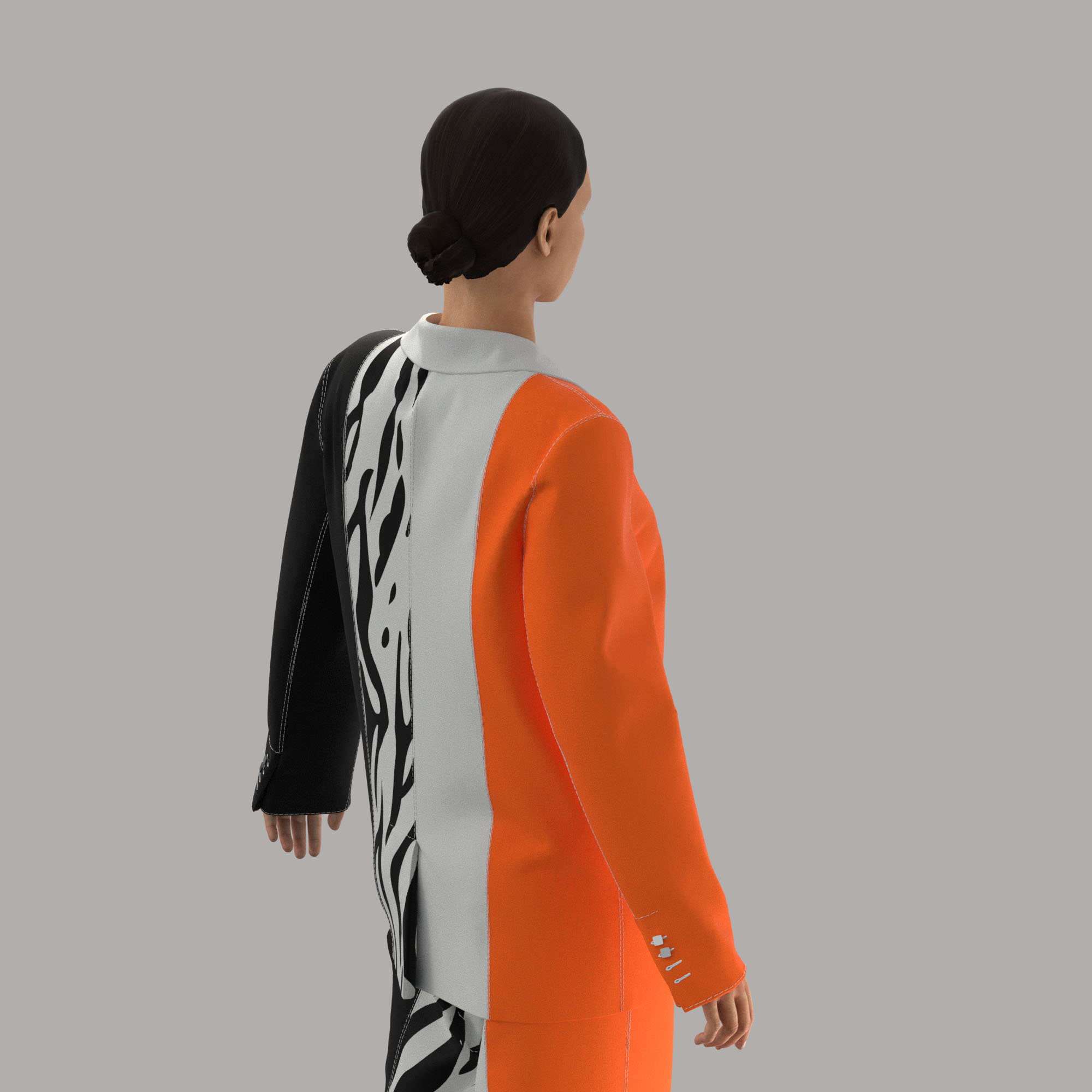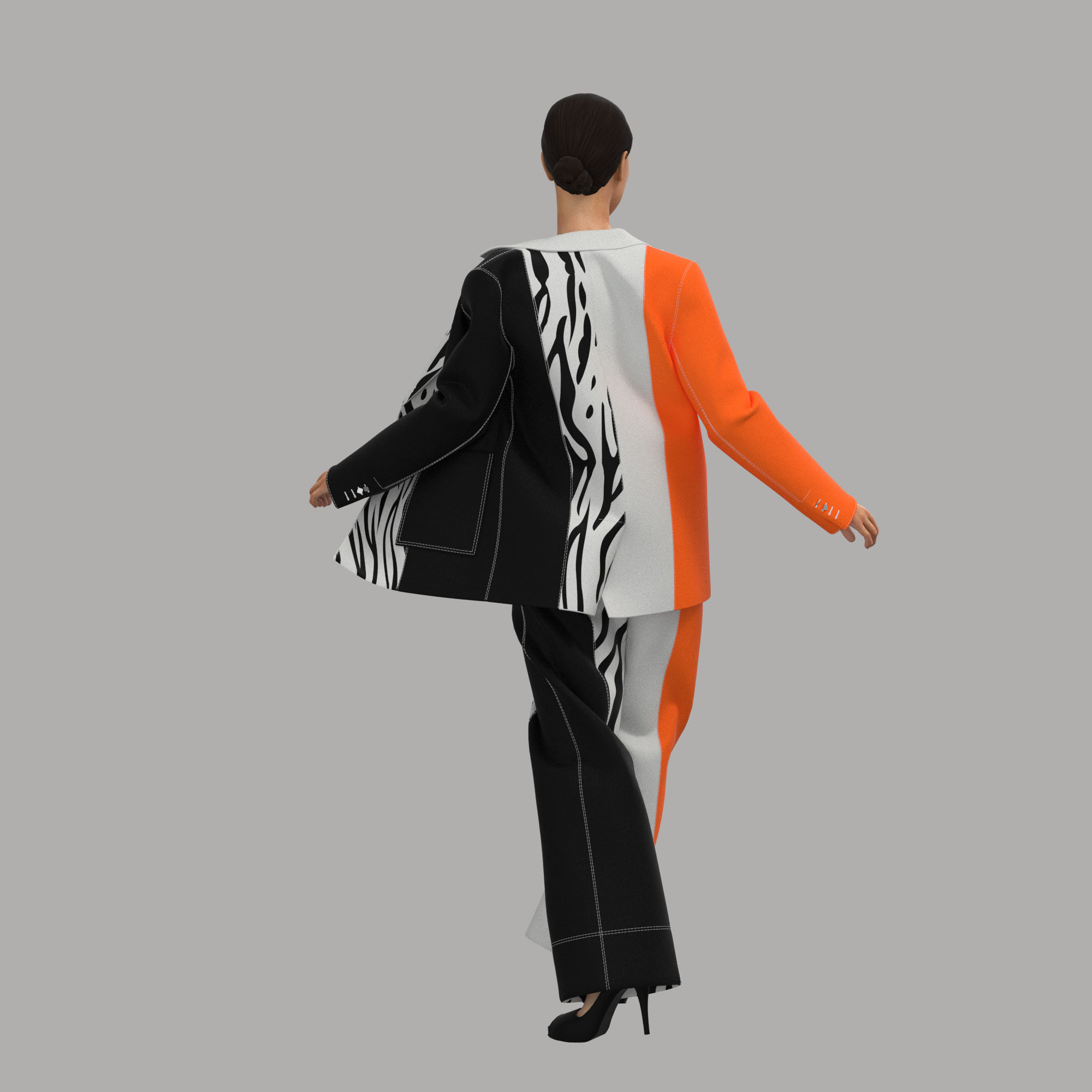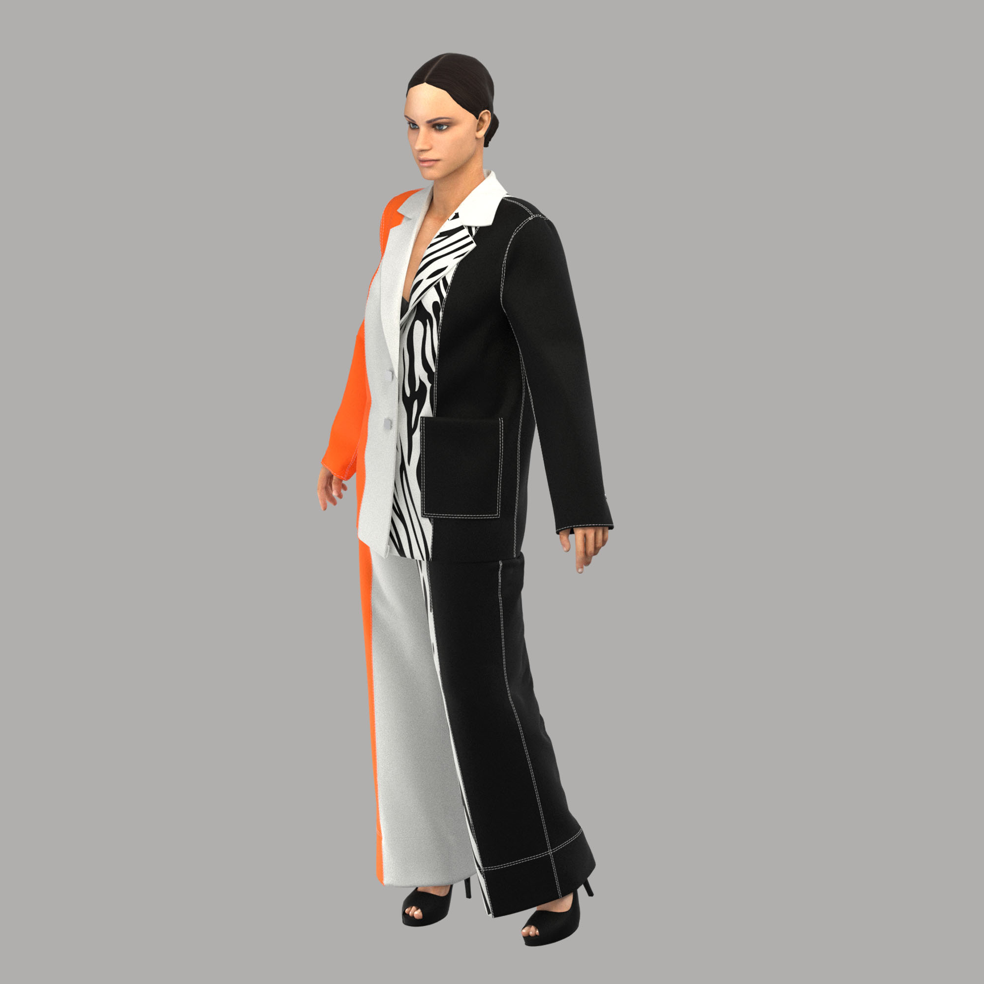 Original four-color combined pantsuit, the combination of colors can be chosen individually depending on preferences in contrast or monochrome variant, which will give expressiveness and effectivity to a woman’s image. Jacket and pants of free silhouette are perfect for street style look, allowing you to stand out and draw attention to yourself. Long jacket on a fitted lining with a single-breasted fastening on two buttons in the color of the fabric. On the front and back of the jacket longitudinal reliefs from the shoulder. On the left shelf is a patch pocket of rectangular shape with a one-piece fitted lapel, decorated with a button. The sleeve of the jacket is double seam, at the bottom of the elbow seam open slits decorated with four buttons. Pants with relief seams on the front and back halves. There are oblique pockets in the side seams of the pants, the waistband is sewn on with slits. Zipper codpiece on the zipper braid. The suit is best worn open, with a top, T-shirt or turtleneck under the bottom, depending on the mood or season. The length of the jacket of the basic size (46/164) is 72 cm, the length of the pants is 103 cm.