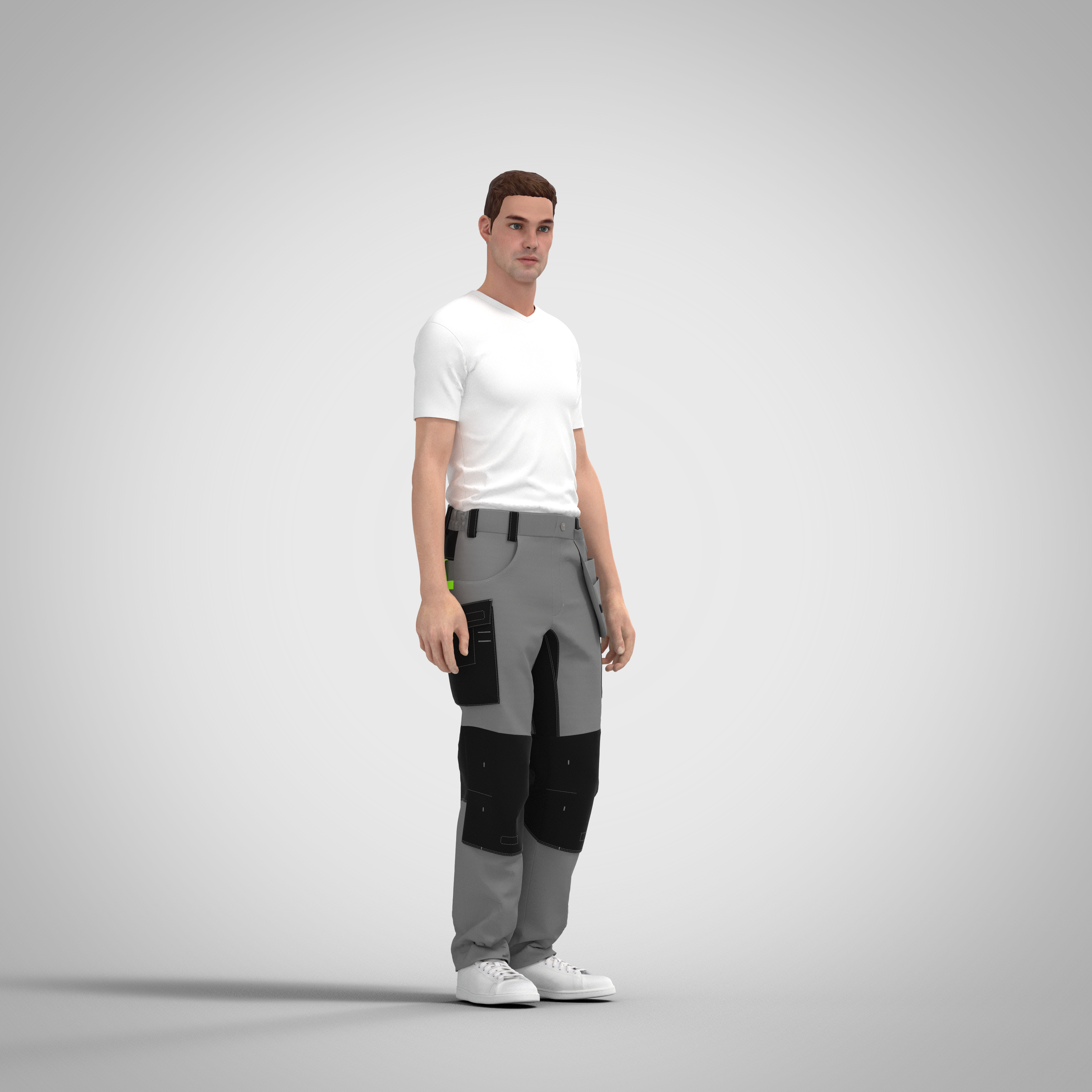 Men’s special purpose pants, designed to protect against harmful and hazardous factors for the health of the production employee at the workplace. Pants of straight silhouette, loose, with a medium fit at the waist line. The upper cut of the pants is processed by a wide fitted belt with six rivets and one central wide shaped rivet on the back half of the pants for fixing a belt and a hinged bag, in the area of side seams between the rivets inside the belt there is an elastic band (elastic band), the back part of the belt is exaggerated and has a shaped upper cut. The waistband fastens with a button and a loop, the zipper “gulf” on the “zipper” is processed in the middle seam of the front halves of the pants. The front halves consist of two parts, upper and lower. The back halves of the pants consist of three parts, top, center and bottom, in the step cuts in the area of the fold, there is an elastic gusset. The front halves of the pants with internal side pockets without a cut-off barrel with a “shaped entrance” to the pocket. Two functional voluminous patch pockets “briefcase”, located on the side seams of the pants above the knee level, pockets of rectangular shape with a slope on the upper cut. On the right pant leg there is a patch pocket with a Velcro flap, with an internal pocket and two functional slit loops. On the left pant leg, the “entrance to the patch pocket” is decorated with a functional “zipper” braid. Both pockets have two darts (in the front corner and in the center) to increase the volume. The back halves of the pants with straight basques, in the connecting seams of the basques with the product there are internal pockets, on the edges of the “pocket entrance” fasteners. On the right back half of the pants above the patch pocket there is an internal pocket with a leaf, with a deep sack for placing tools. Front halves with reinforced knee pads, knee pads with two horizontal darts and four fasteners for fixing the knee pads, fastened with Velcro. The upper cuts of the kneepads are slanted, the lower cuts are straight. On the back halves in the knee area there are inserts of elastic fabric with slanted upper and lower cuts. On the back right half of the pants, there is a loop made of reflective tape, one end of which is sewn into the basque and the other into the side seam. The middle seam of the back half is decorated with a double finishing stitch, the bottom is worked with a seam in the hem with a closed cut. Removable hinged tool bag with patronage is attached to the shoulder straps with a strap on metal buttons. The pants are made of blended fabric (cotton, polyester), the basque, inserts and gusset are made of elastane. The color of the main fabric is dark gray. The length of the basic size 52/176 – 98.0 cm, the consumption of the main fabric 1.40 m. Recommended sizes: 46 – 56, height 158 – 188.
