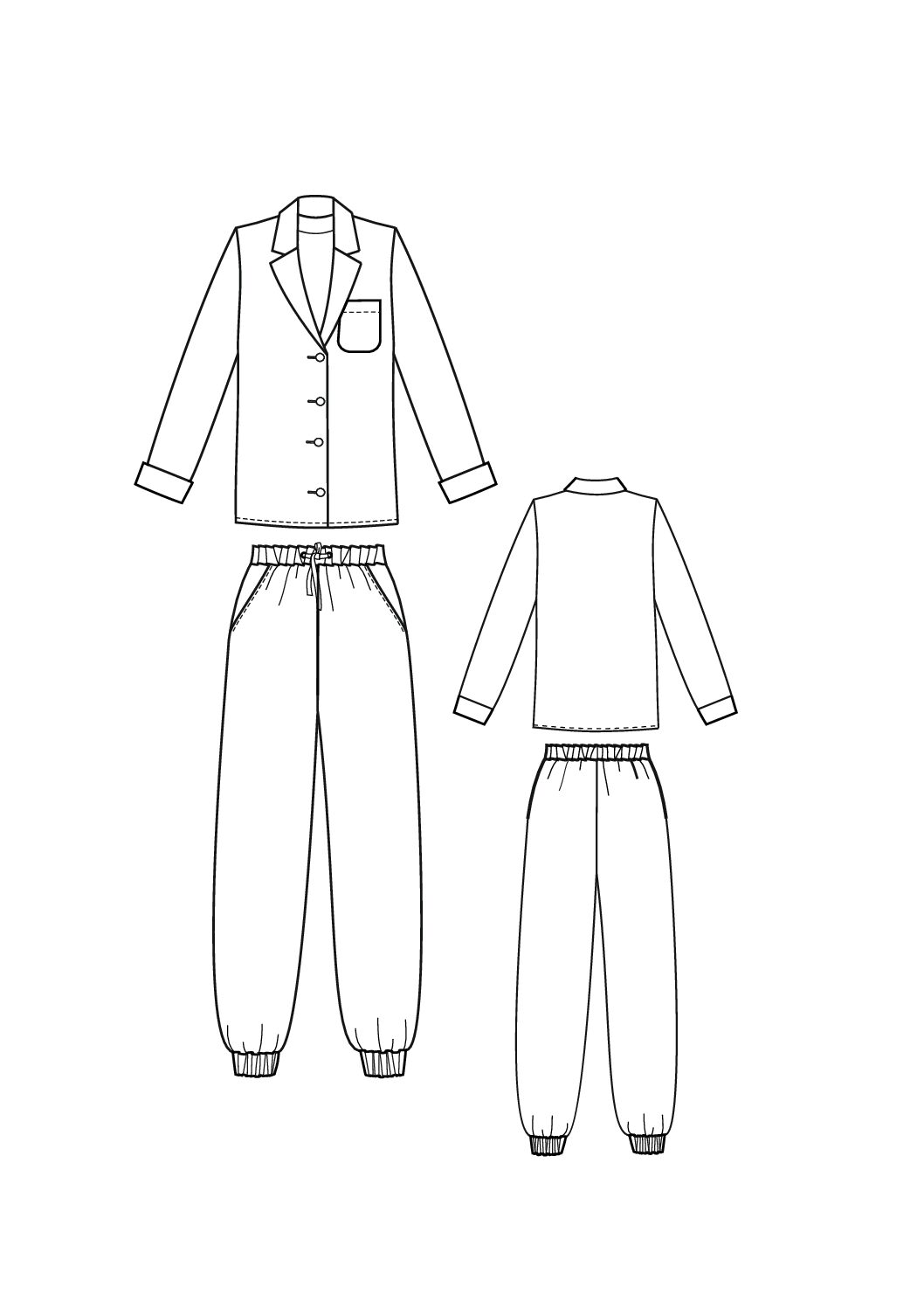 Women’s home costume, consists of a shirt and pants. Shirt of straight silhouette, moderate volume, with a central side fastening with buttons and loops, lapel collar of jacket type, length below the hip line. There is a patch pocket of rectangular shape with rounded lower edges on the right shelf at the level of the chest line. The back is whole. The sleeve is fitted, shirt, single seam, the bottom of the sleeve is trimmed with a one-piece cuff. Collar with pointed ends of lapels and collar. Pants are straight, loose, ankle-length. The upper cut of the pants is decorated with a waistband on the elastic band with a cuff, which creates a gathering. On the front there are trimmed oblique pockets. The bottom of the pants is gathered on the elastic band. Base size: height -164 cm., chest circumference – 92 cm., hip circumference – 98.0 (100 cm.) The length of the base size shirt on the middle seam of the back – 70.0 cm., the length of the base size pants on the side seam including the belt – 99.0 cm. Basic fabric consumption 3.00 m. Recommended sizes: 40 – 54 (chest circumference 80.0 cm. – 108.0 cm.), height 152 – 182.