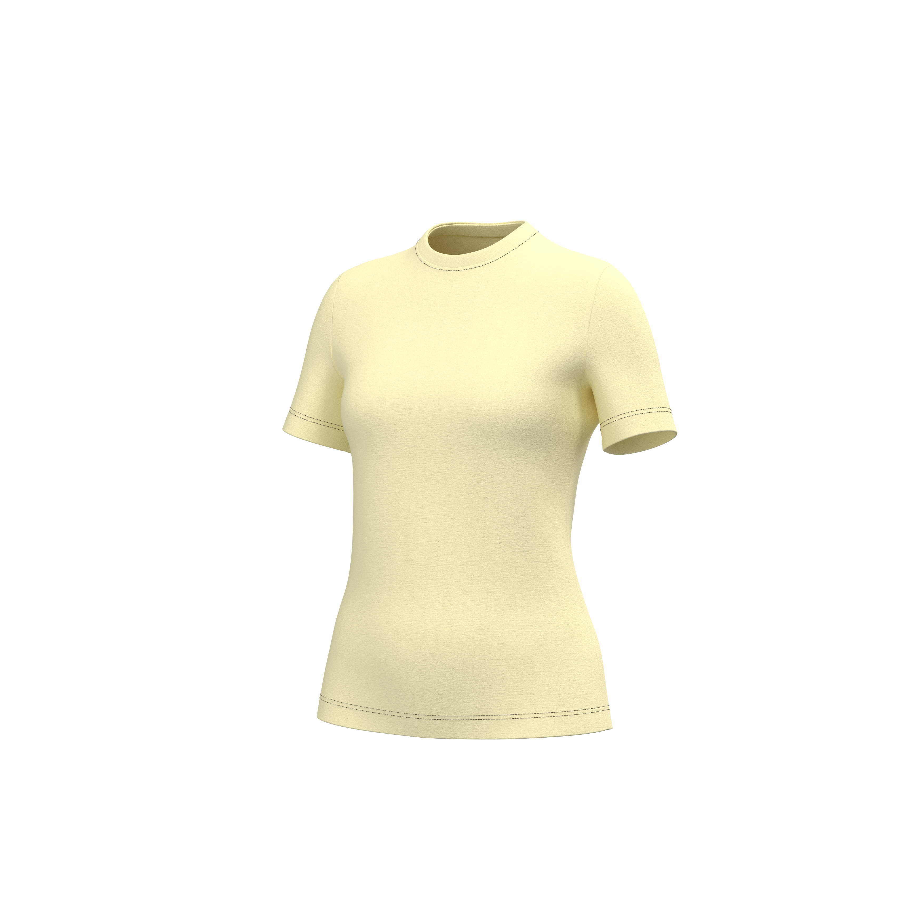Женская трикотажная футболка с короткими рукавами выше локтя, округлым вырезом, длиною ниже линии бедер, имеет легкое прилегание в области талии.