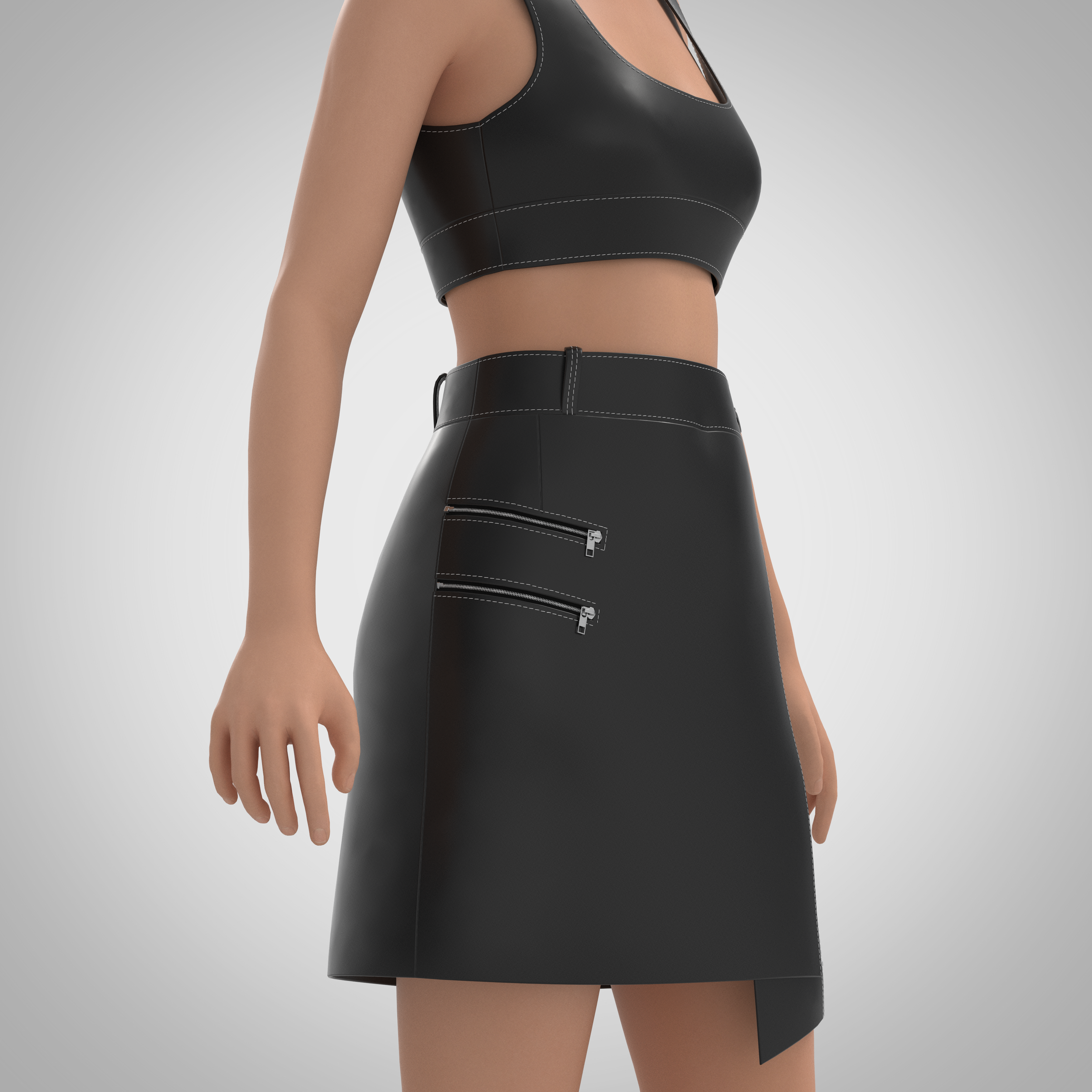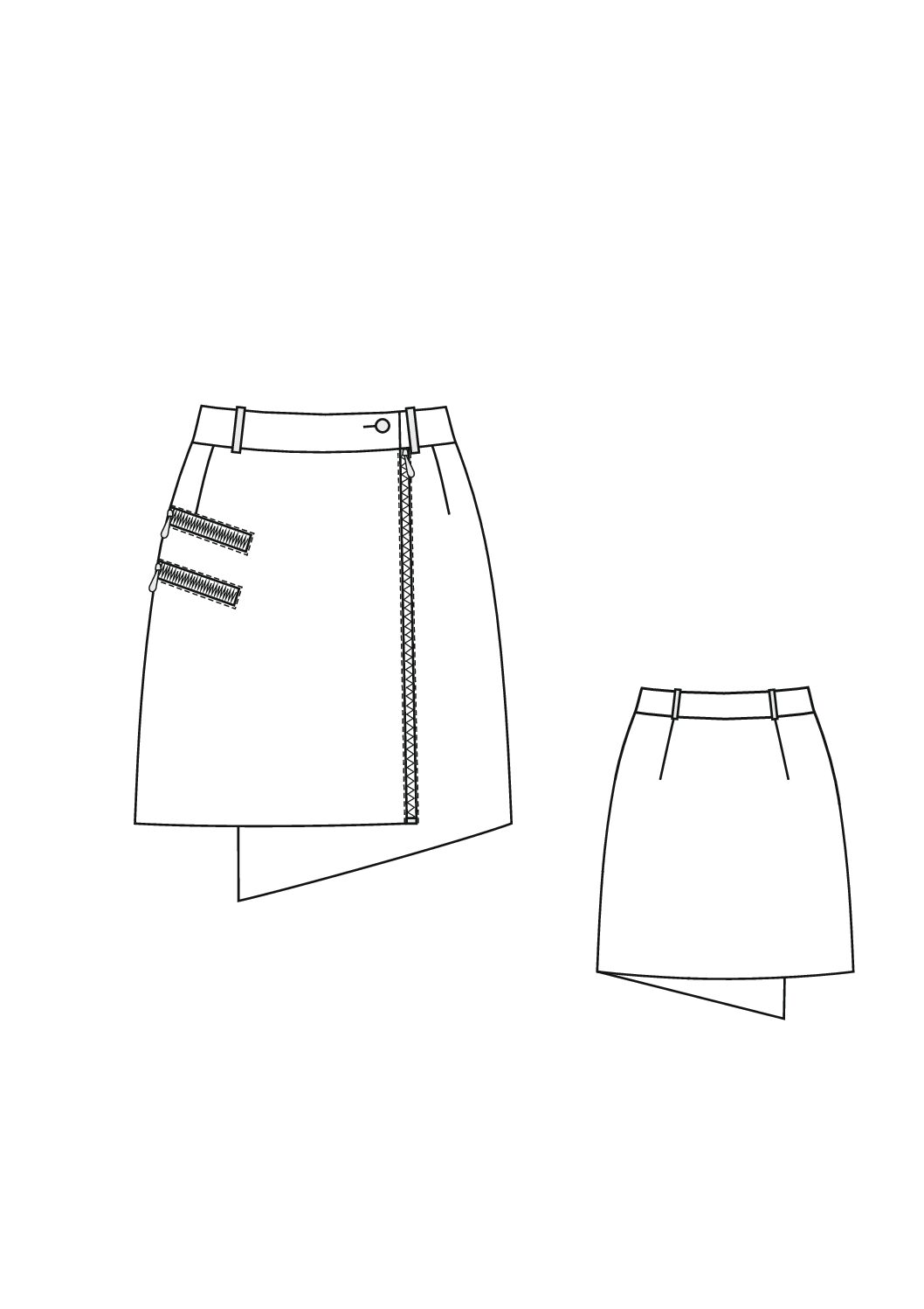 Предлагаем вам мини юбку А-силуэта на притачной подкладке, с запахом, на притачном поясе, с застежкой на молнию, двумя карманами на молнии один из которых декоративный, карманы расположены на правом полотнище юбки, с талевыми вытачками на переднем и заднем полотнищах. Пояс с четырьмя шлевками, застегивается на петлю и пуговицу. Низ юбка ассиметричный.